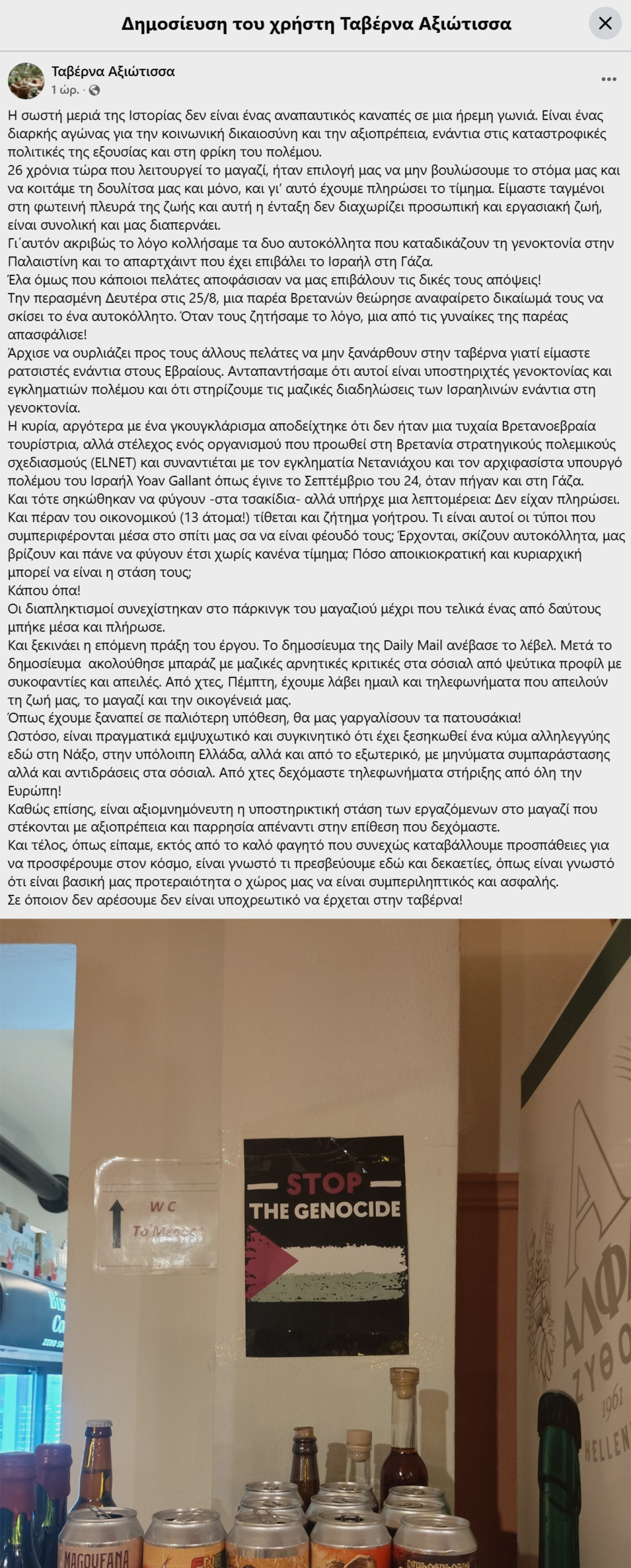 An uproar broke out at the “Axiotissa” taverna in Naxos on Monday, August 25, when a group of 13 Jews from London clashed with the restaurant owners over stickers and posters supporting Palestine and opposing Israel displayed inside the establishment.