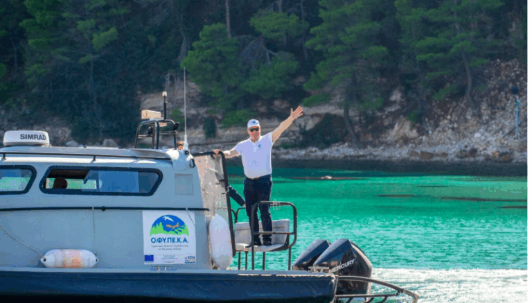 Accompanied by the Secretary General of the Ministry of Environment and Energy, Petros Varelidis, and the President of OFYPEKA, Maria Papadopoulou, the Prince also toured the marine areas near Skopelos on the OFYPEKA vessel. There, in collaboration with Panos Dendrinos, President of the environmental organization MoM, he was guided through caves that serve as critical breeding sites for the Mediterranean monk seal.