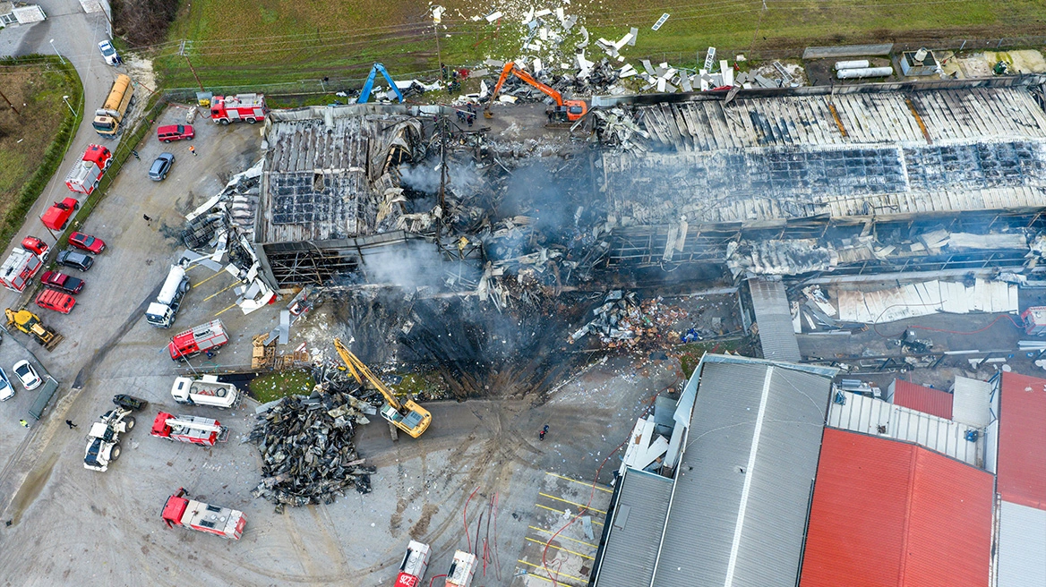 The fire broke out in the early hours of Monday, shortly before 4:00 a.m., and burned part of the factory’s wing. A short time earlier, a powerful explosion had occurred in the basement of the factory’s main building, which is located on the Trikala–Karditsa national highway.