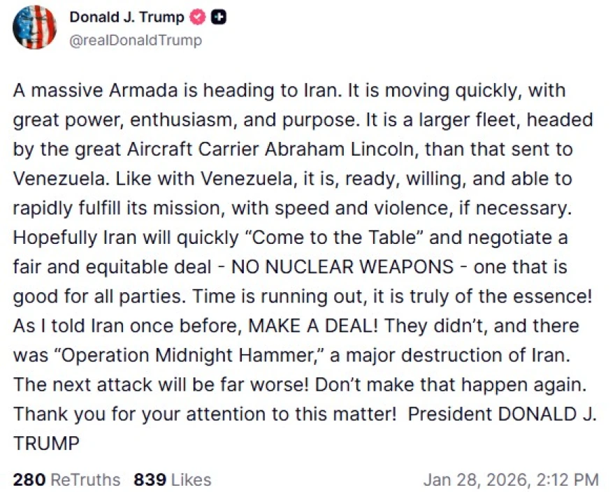 In a post, Trump said that the armada, led by the aircraft carrier USS Abraham Lincoln, is moving with “great speed, great power, enthusiasm, and determination,” stressing that it is a larger fleet than the one sent to Venezuela.