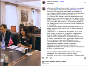 “It was not the first meeting and acquaintance with the US Ambassador to Greece @kimberlyguilfoyle, but it was the most meaningful, as during her visit to the Ministry of Education, we had the opportunity to talk in depth about things that she herself knows well.