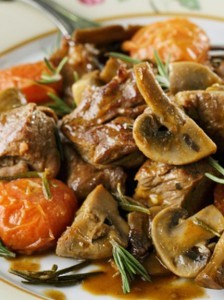 Roast lamb with mushrooms, tomato and rosemary