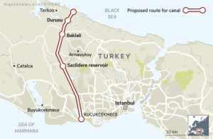 A planned 45-kilometer, $25 billion waterway linking the Marmara and Black seas, running parallel to the Bosphorus