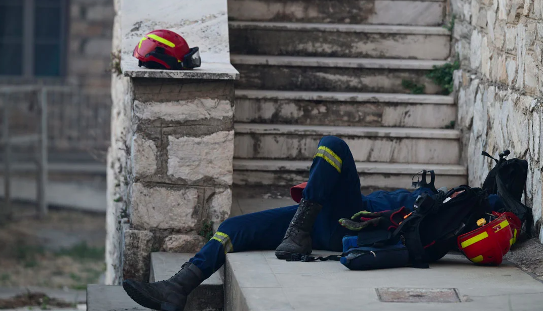 Devastation in Northeastern Attica: The Heart-Wrenching Image of an Exhausted Firefighter