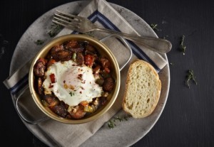 Delicious saganaki with sausage, anthotyro and egg