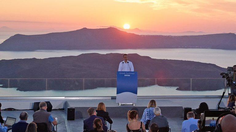 The media used Santorini and PM Mitsotakis's speech at the picturesque island