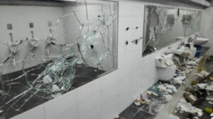 Unidentified people caused damage to the toilets by breaking mirrors and sinks