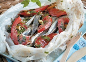 Parchment baked fresh anchovies with tomato and herbs
