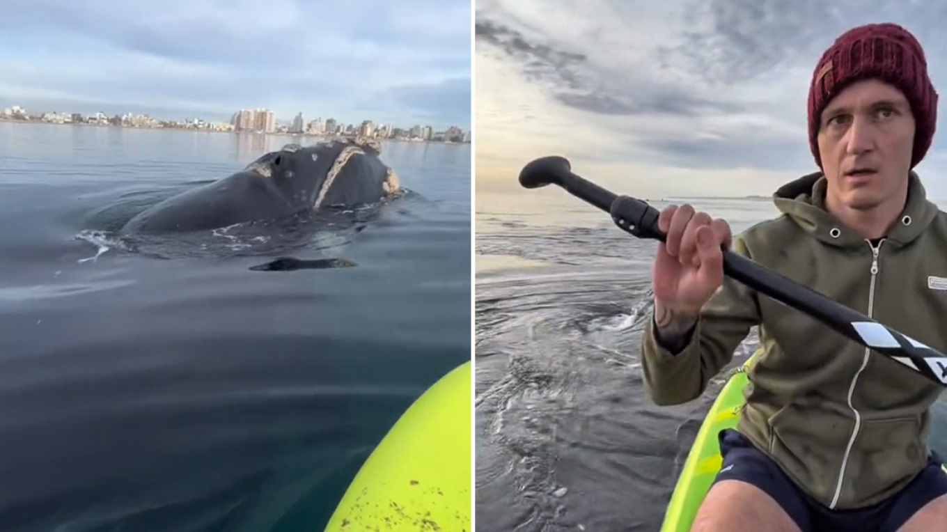 The young man was kayaking in the Strait of Magellan when the incident occurred and his father captured it on video